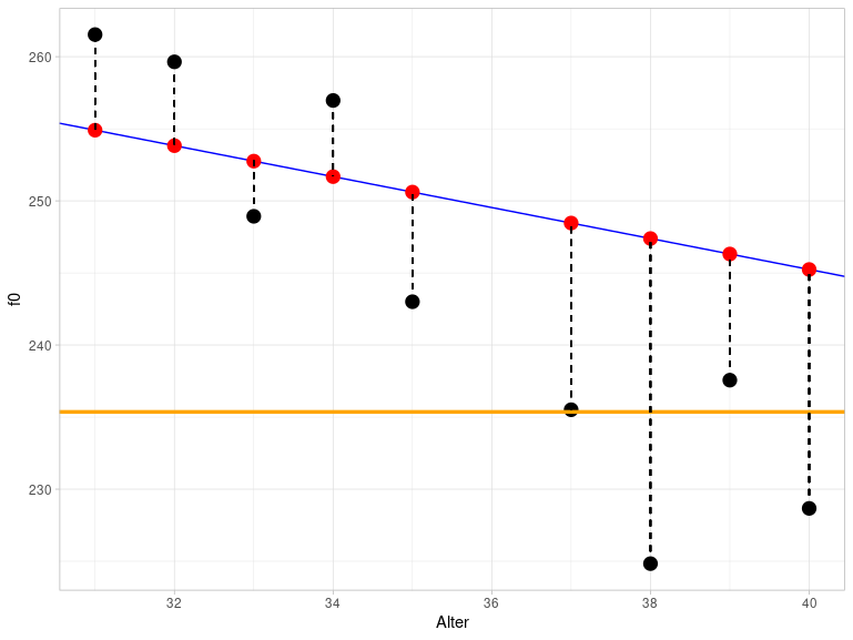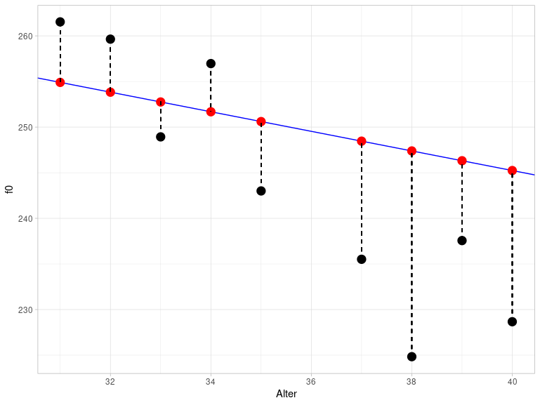 Die Differenzen zwischen den geschätzten und gemessenen \(y\)-Werten werden Residuals genannt. Die folgende Abbildung zeigt einen Ausschnitt aus dem vorherigen Plot für die Altersspanne zwischen 30 und 40 Jahren. Die schwarzen Punkte sind die tatsächlich gemessenen f0-Werte, die roten Punkte hingegen sind die geschätzten Werte. Sie liegen genau auf der blauen Regressionslinie. Die vertikalen gestrichelten Linien stellen die Residuals dar. Diese Abbildung verdeutlicht, weshalb Residuals auch als Error bezeichnet werden.