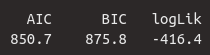 , steht die Anzahl an Parametern, die für das Modell geschätzt wurde. Anschließend sehen wir die Informationskriterien AIC