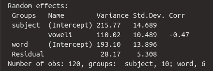 Allgemein wird davon ausgegangen, dass auch ein Random Intercept geschätzt werden soll, wenn wir Random Slopes schätzen. Daher ist die Formel für Random Slopes (1 + vowel | subject)